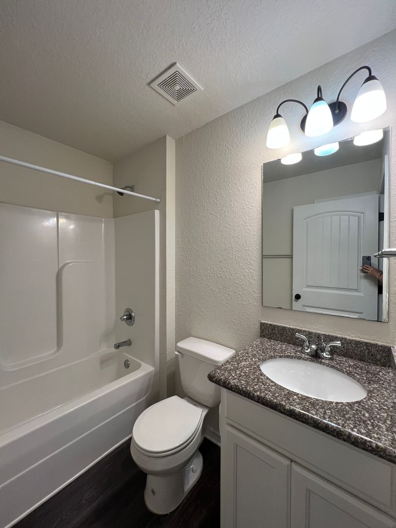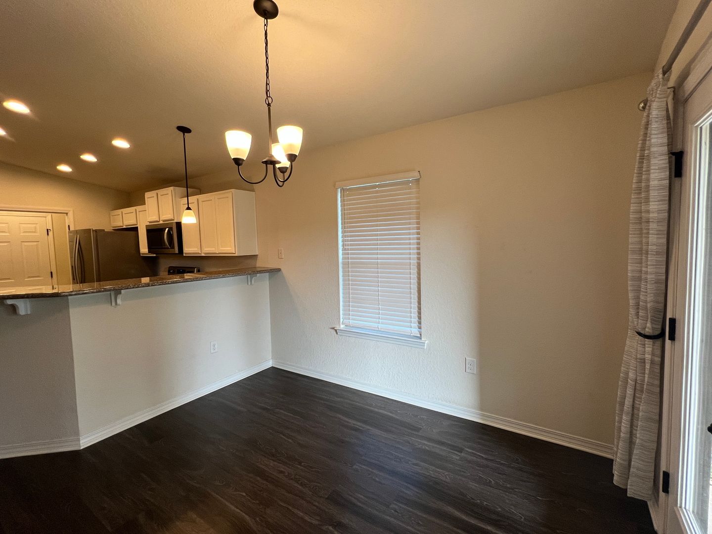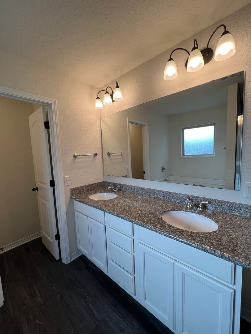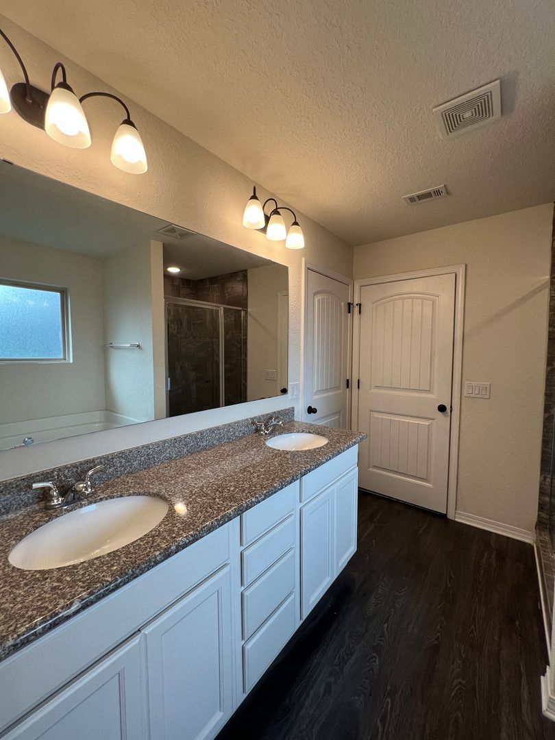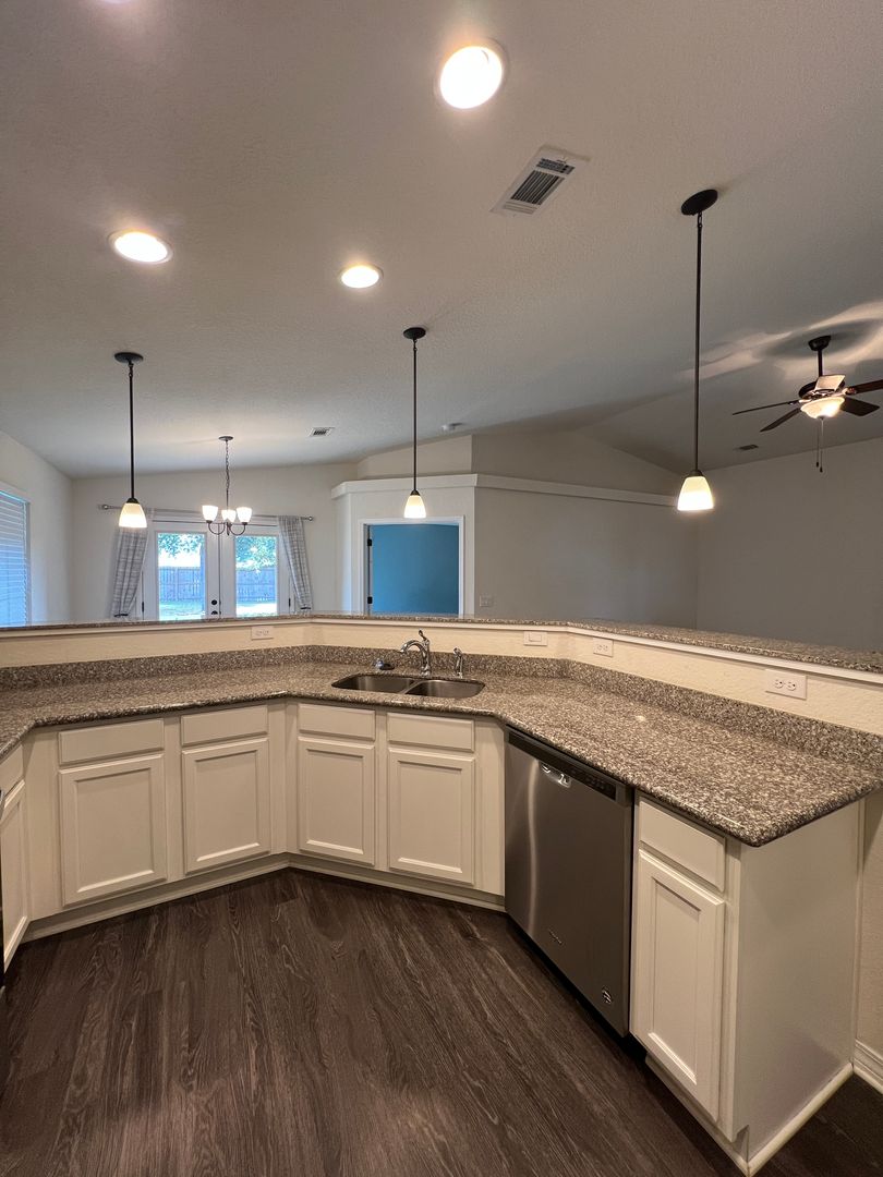This is the home you've been hoping for with its large, open floor plan, beautiful wood laminate flooring throughout the common areas, and lots of kitchen upgrades. Through the front door you'll immediately set your eyes upon an expansive living room with vaulted ceilings; this space is genuinely large and easily accommodates lots of furniture and configurations. The open layout also makes entertaining easy. The kitchen is a nicely equipped with granite counters, tons of storage, stainless appliances. And for dining, you'll find a nice space to enjoy meals and the breakfast bar helps too. The guest rooms and guest bath are located at the front of the home. Each guest room provides plenty of space and generously sized closets too. At the back of the home is where you'll discover the master bedroom. This room features a trey ceiling for some additional style, and a pair of windows with a great view of the backyard. The master bathroom has plenty of upgrades too with dual vanities set in a granite counter, a tile surround shower, and large, soaking tub. There's also a large, walk-in closet too. If you enjoy a little time outdoors, you'll really love the covered patio area, and the spacious backyard with a full, privacy fence surround; this is a great space for enjoying the mornings or evenings. This home isn't expect to be around long so contact us to check it out before it's gone.