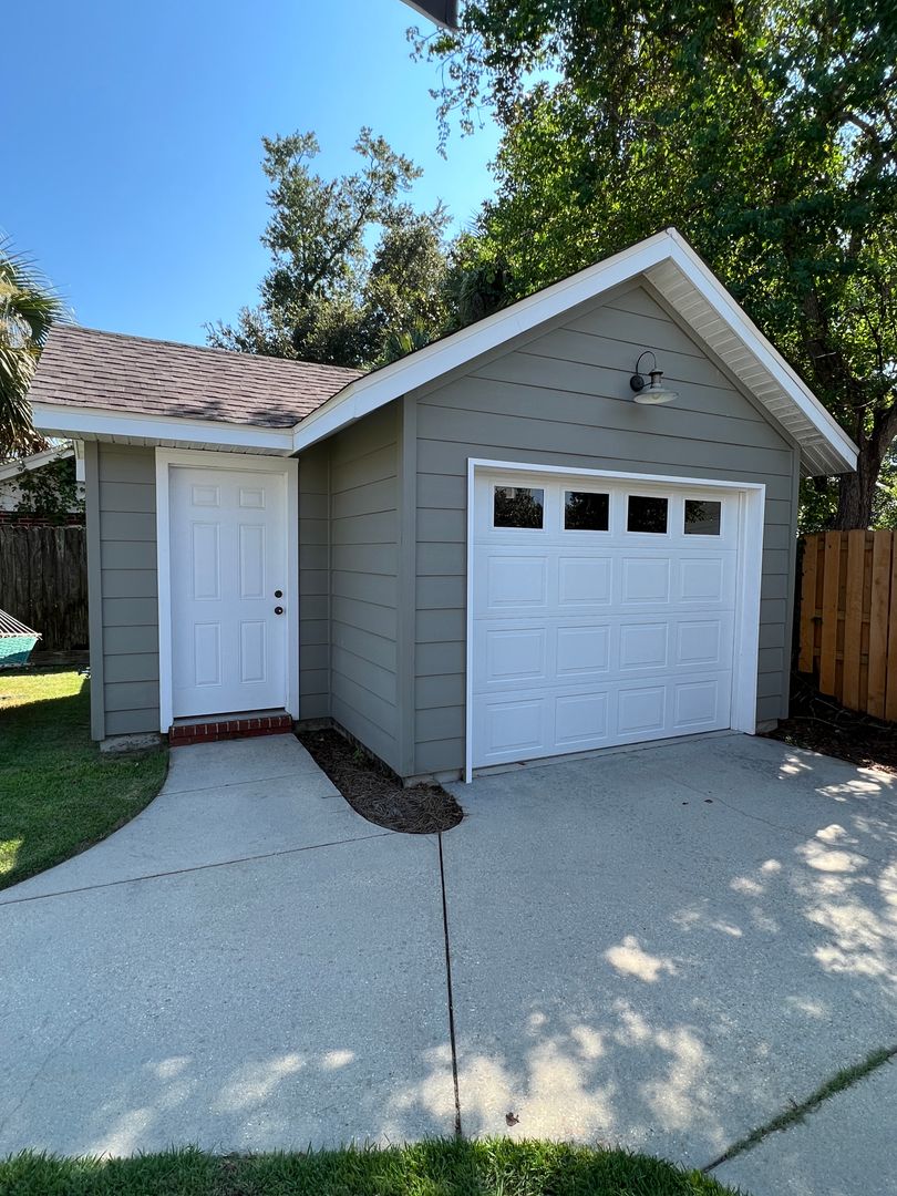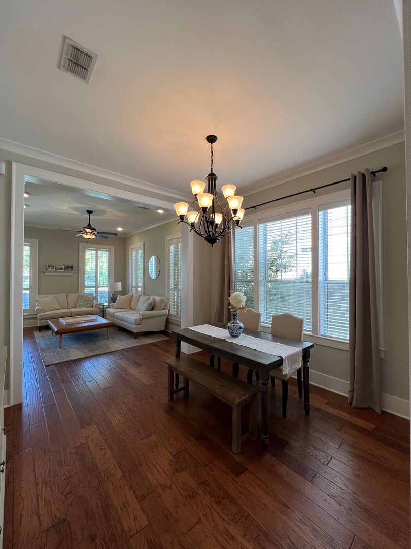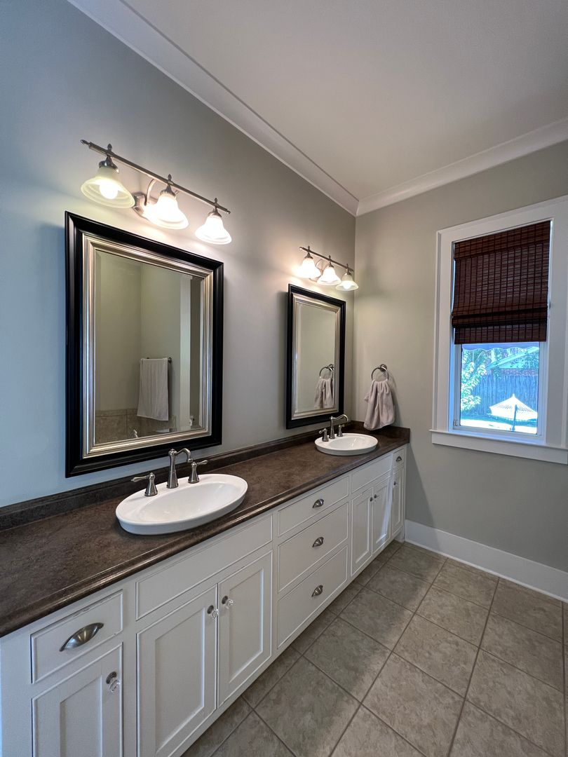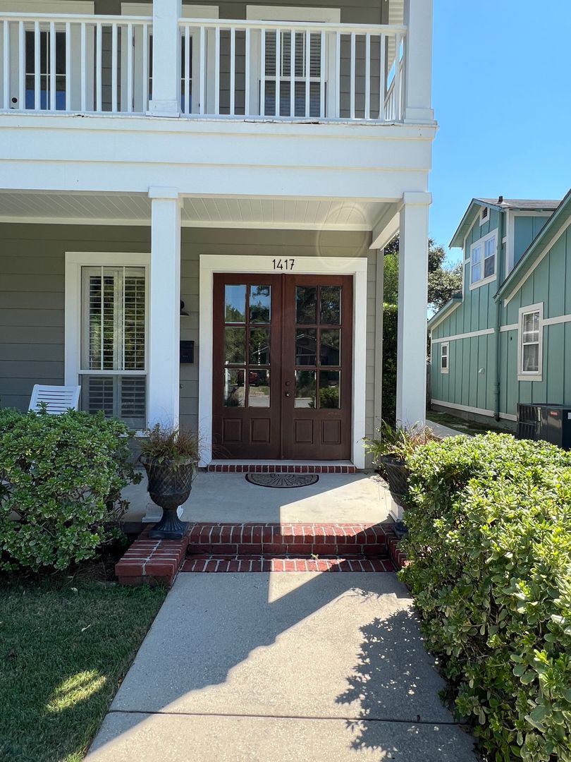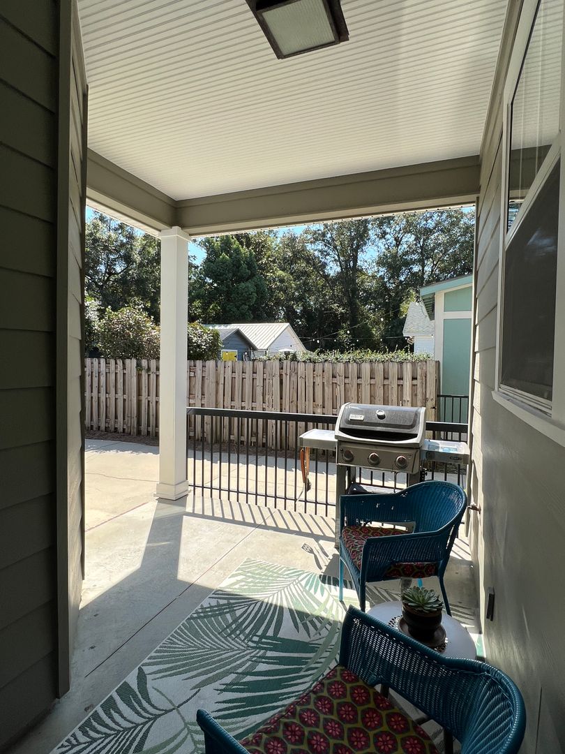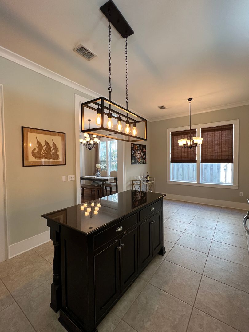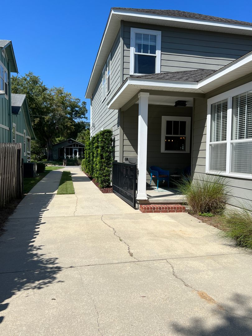 This beautiful and elegant East Hill homes offers access to parks, boutique shopping, and downtown Pensacola. This walker/biker friendly community offers sidewalks for strolling and taking in the charming views of old oak trees dripping with Spanish moss and historic buildings. Amidst all this and more, you'll discover this beautiful and sophisticatedly designed two story home. A well maintained lawn with simple and sharply kept hedge greet you upon arrival. The home's driveway ultimately hides a wonderful backyard space and single car garage. From the street you can take in the porch and balcony that serve as great spots for relaxing in the mornings and evenings. Through the French door entry you'll find yourself in the home's foyer with easy access to the staircase and powder room. Here too you'll get the first taste of the elegant features that run throughout this home with the large baseboard and crown molding that pair perfectly with the soft-toned paint scheme found in the home. A large portal to your left offers access to the living room. A number of tall windows with plantation shutters allow for plenty of natural light and leave the space feeling airy. The focal point of the living room is the micro-tiled fireplace that gives just a touch of modern vibe to the space. Beyond the living room you'll find the formal dining space. Here too is a large window that provides more natural light and the whole room rests under a beautiful and large, black iron chandelier. The formal dining room gives way to the family dining space and kitchen. Sand colored tile partners with beautiful, wood cabinetry and contrasts perfectly against the black counters. You'll discover the laundry area just off the kitchen and also a landing zone which provides separation between the family dining space and the owner's suite. This landing zone also offers access to the backyard, the covered patio, and the extended patio beyond. The owner's suite will accommodate large bedroom furnishings, and the adjoining bathroom includes dual vanities, a soaking tub with tile surround, and walk-in shower. The guest rooms and additional full bathroom are located on the second floor. A landing area at the top of the stairs makes for a great study or reading space. The balcony is accessible from two of the guest rooms which can also serve as great office spaces. The full bathroom upstairs includes dual vanities and a shower/tub combo; a pocket door entrance to the largest guest room also transforms that bedroom into a kind of in-suite. The home's backyard is a charming space to relax and grill and with plenty of covered seating space you can enjoy it rain or shine. The detached garage holds a single car and a small attached storage room is a great spot for keeping holiday decor.