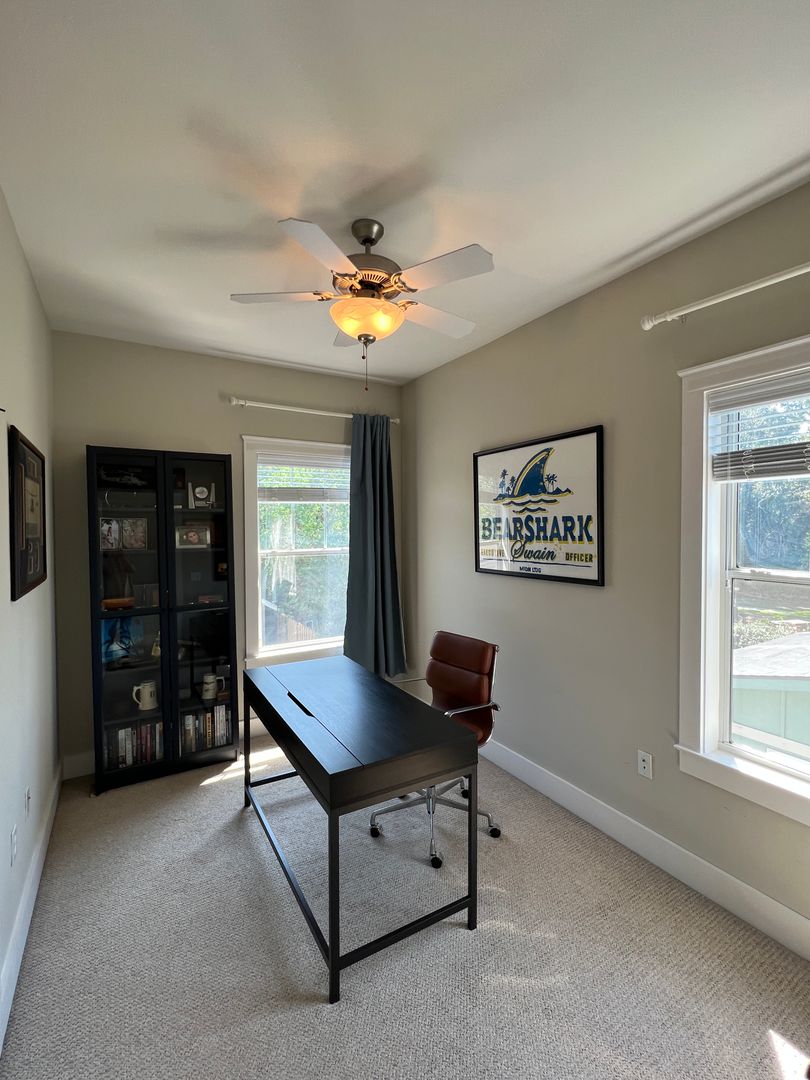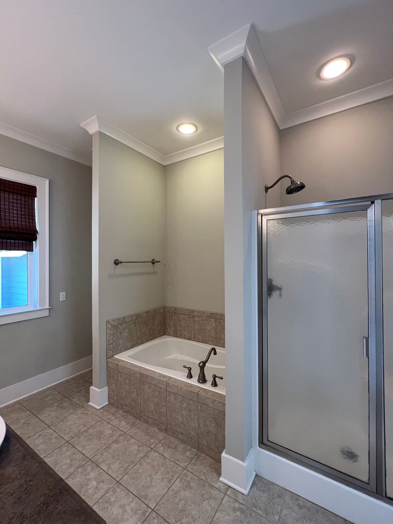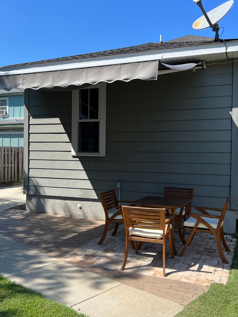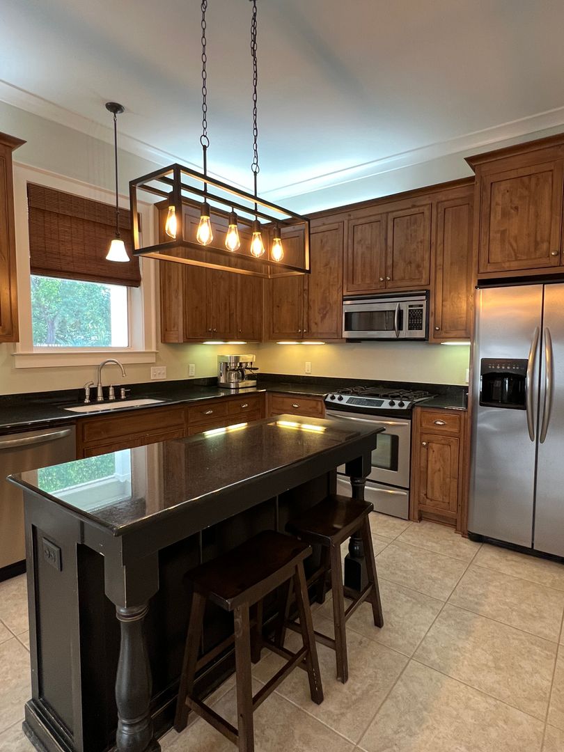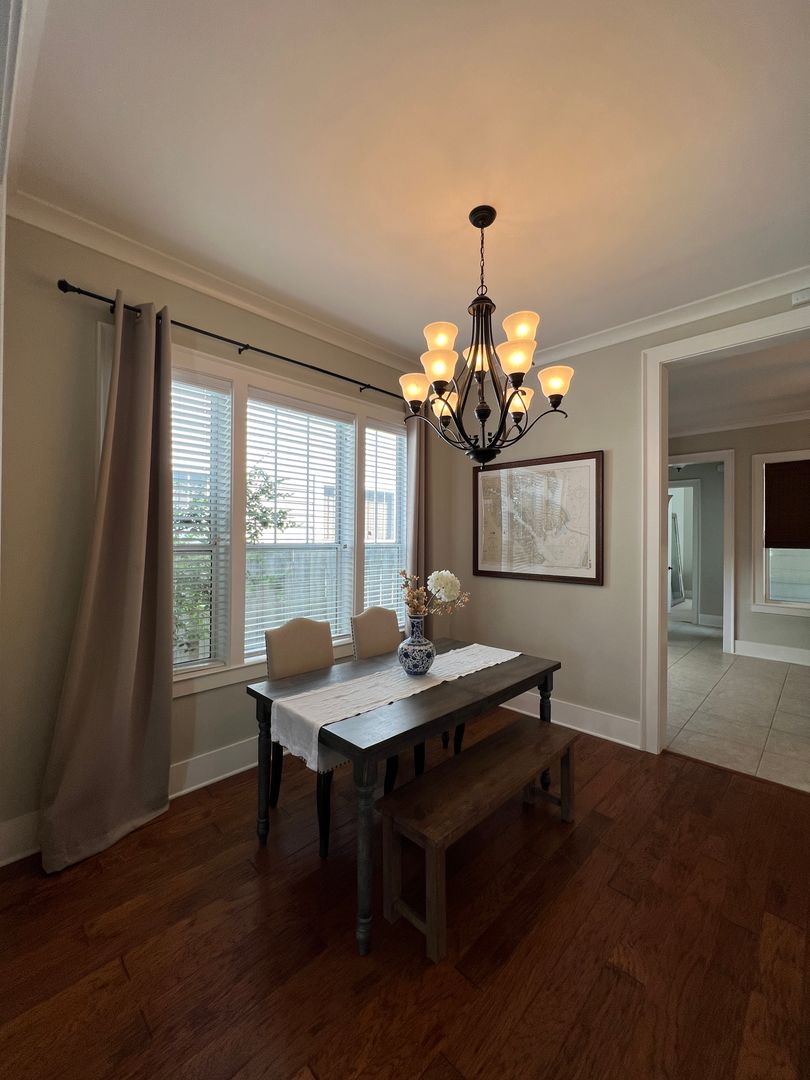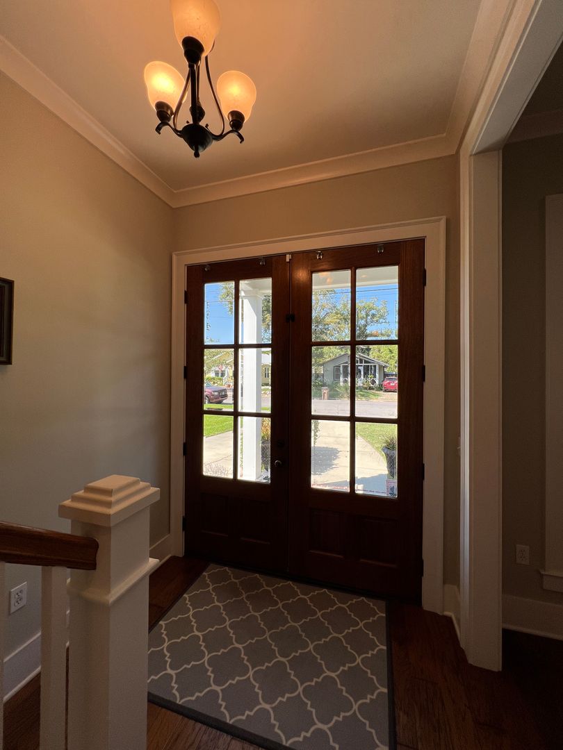 This beautiful and elegant East Hill homes offers access to parks, boutique shopping, and downtown Pensacola. This walker/biker friendly community offers sidewalks for strolling and taking in the charming views of old oak trees dripping with Spanish moss and historic buildings. Amidst all this and more, you'll discover this beautiful and sophisticatedly designed two story home. A well maintained lawn with simple and sharply kept hedge greet you upon arrival. The home's driveway ultimately hides a wonderful backyard space and single car garage. From the street you can take in the porch and balcony that serve as great spots for relaxing in the mornings and evenings. Through the French door entry you'll find yourself in the home's foyer with easy access to the staircase and powder room. Here too you'll get the first taste of the elegant features that run throughout this home with the large baseboard and crown molding that pair perfectly with the soft-toned paint scheme found in the home. A large portal to your left offers access to the living room. A number of tall windows with plantation shutters allow for plenty of natural light and leave the space feeling airy. The focal point of the living room is the micro-tiled fireplace that gives just a touch of modern vibe to the space. Beyond the living room you'll find the formal dining space. Here too is a large window that provides more natural light and the whole room rests under a beautiful and large, black iron chandelier. The formal dining room gives way to the family dining space and kitchen. Sand colored tile partners with beautiful, wood cabinetry and contrasts perfectly against the black counters. You'll discover the laundry area just off the kitchen and also a landing zone which provides separation between the family dining space and the owner's suite. This landing zone also offers access to the backyard, the covered patio, and the extended patio beyond. The owner's suite will accommodate large bedroom furnishings, and the adjoining bathroom includes dual vanities, a soaking tub with tile surround, and walk-in shower. The guest rooms and additional full bathroom are located on the second floor. A landing area at the top of the stairs makes for a great study or reading space. The balcony is accessible from two of the guest rooms which can also serve as great office spaces. The full bathroom upstairs includes dual vanities and a shower/tub combo; a pocket door entrance to the largest guest room also transforms that bedroom into a kind of in-suite. The home's backyard is a charming space to relax and grill and with plenty of covered seating space you can enjoy it rain or shine. The detached garage holds a single car and a small attached storage room is a great spot for keeping holiday decor.