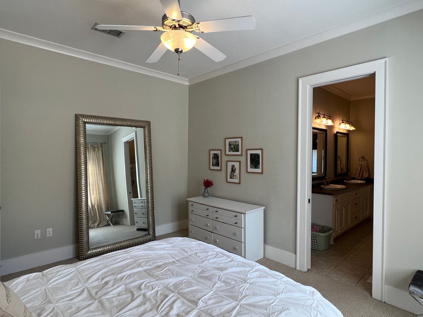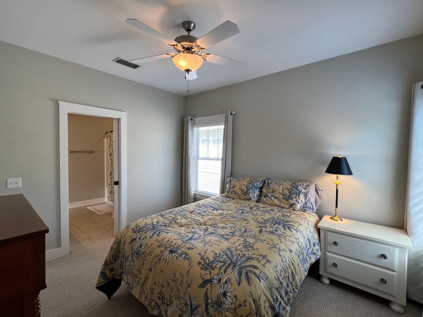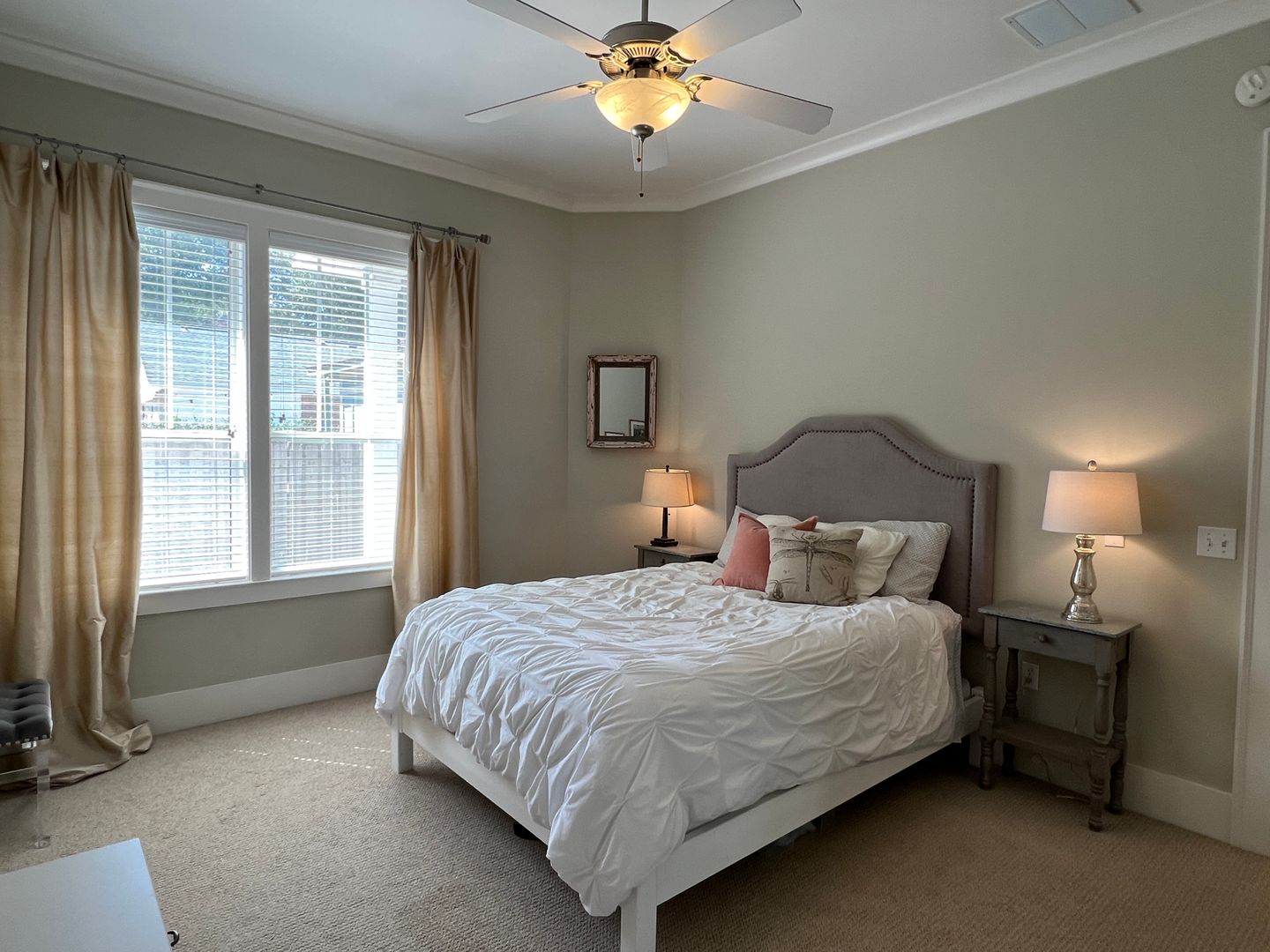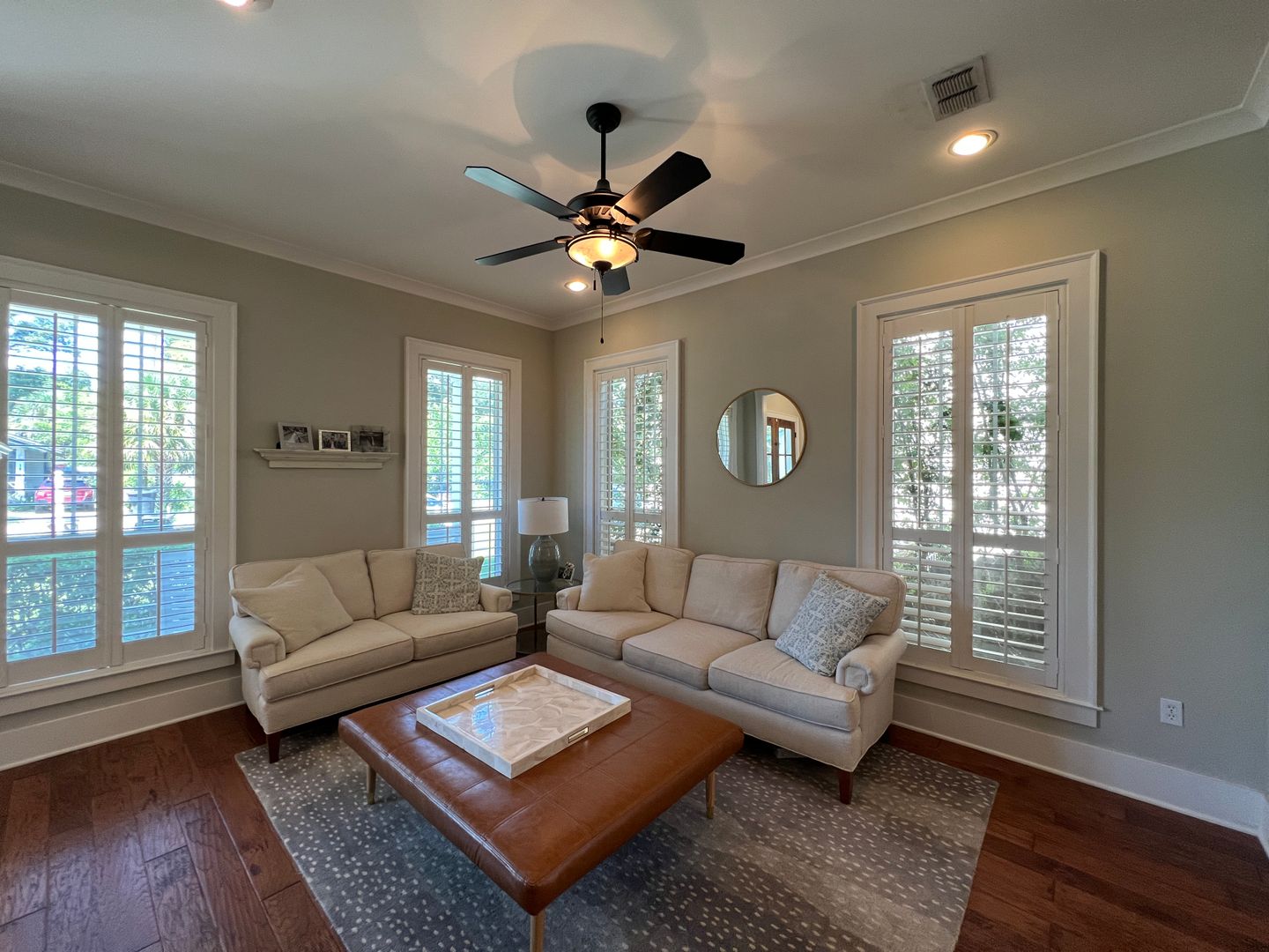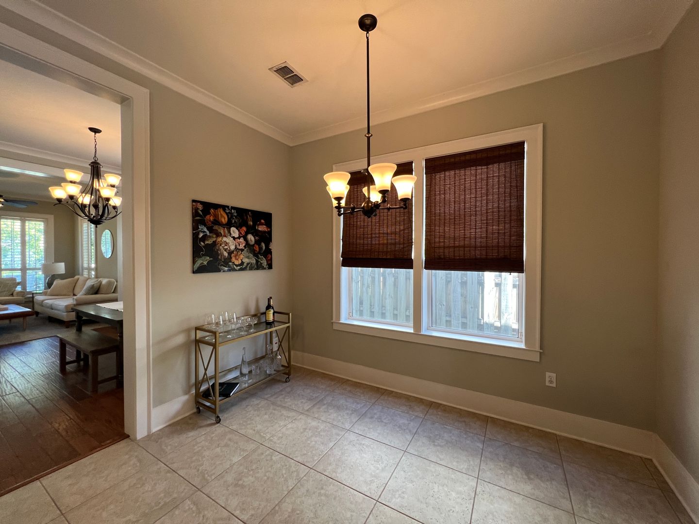 This beautiful and elegant East Hill homes offers access to parks, boutique shopping, and downtown Pensacola. This walker/biker friendly community offers sidewalks for strolling and taking in the charming views of old oak trees dripping with Spanish moss and historic buildings. Amidst all this and more, you'll discover this beautiful and sophisticatedly designed two story home. A well maintained lawn with simple and sharply kept hedge greet you upon arrival. The home's driveway ultimately hides a wonderful backyard space and single car garage. From the street you can take in the porch and balcony that serve as great spots for relaxing in the mornings and evenings. Through the French door entry you'll find yourself in the home's foyer with easy access to the staircase and powder room. Here too you'll get the first taste of the elegant features that run throughout this home with the large baseboard and crown molding that pair perfectly with the soft-toned paint scheme found in the home. A large portal to your left offers access to the living room. A number of tall windows with plantation shutters allow for plenty of natural light and leave the space feeling airy. The focal point of the living room is the micro-tiled fireplace that gives just a touch of modern vibe to the space. Beyond the living room you'll find the formal dining space. Here too is a large window that provides more natural light and the whole room rests under a beautiful and large, black iron chandelier. The formal dining room gives way to the family dining space and kitchen. Sand colored tile partners with beautiful, wood cabinetry and contrasts perfectly against the black counters. You'll discover the laundry area just off the kitchen and also a landing zone which provides separation between the family dining space and the owner's suite. This landing zone also offers access to the backyard, the covered patio, and the extended patio beyond. The owner's suite will accommodate large bedroom furnishings, and the adjoining bathroom includes dual vanities, a soaking tub with tile surround, and walk-in shower. The guest rooms and additional full bathroom are located on the second floor. A landing area at the top of the stairs makes for a great study or reading space. The balcony is accessible from two of the guest rooms which can also serve as great office spaces. The full bathroom upstairs includes dual vanities and a shower/tub combo; a pocket door entrance to the largest guest room also transforms that bedroom into a kind of in-suite. The home's backyard is a charming space to relax and grill and with plenty of covered seating space you can enjoy it rain or shine. The detached garage holds a single car and a small attached storage room is a great spot for keeping holiday decor.